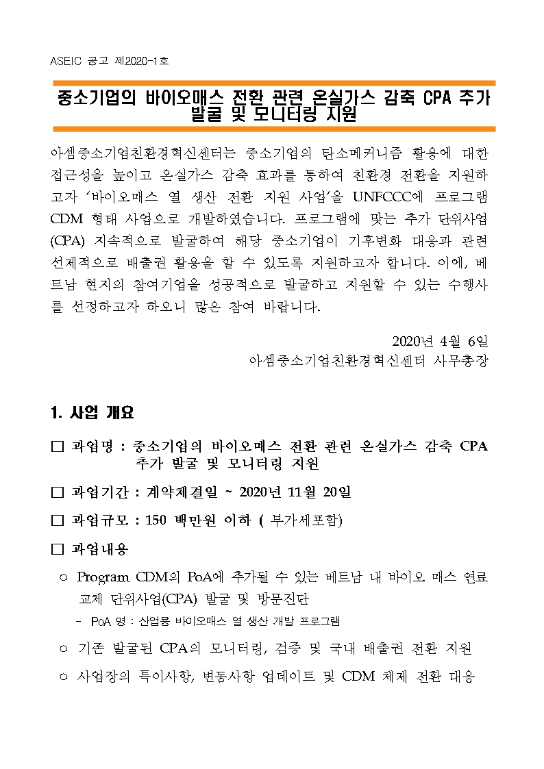 (사업공고) 중소기업의 바이오매스 전환 관련 온실가스 감축 CPA 추가 발굴 및 모니터링 지원 06 Apr 2020