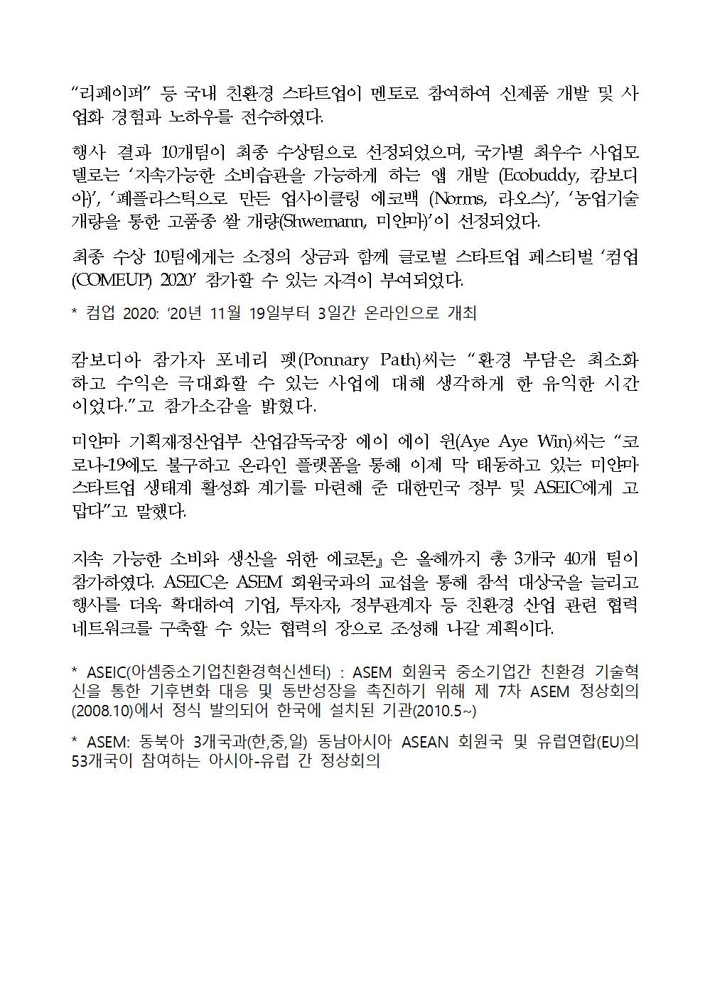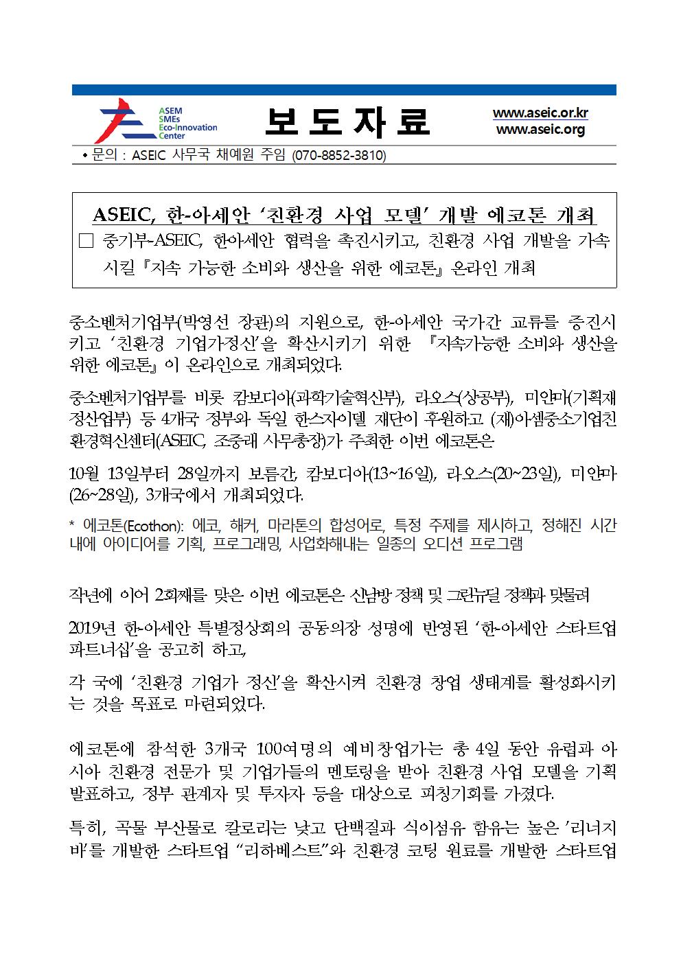 ASEIC, 한-아세안 ‘친환경 사업 모델’ 개발 에코톤 개최