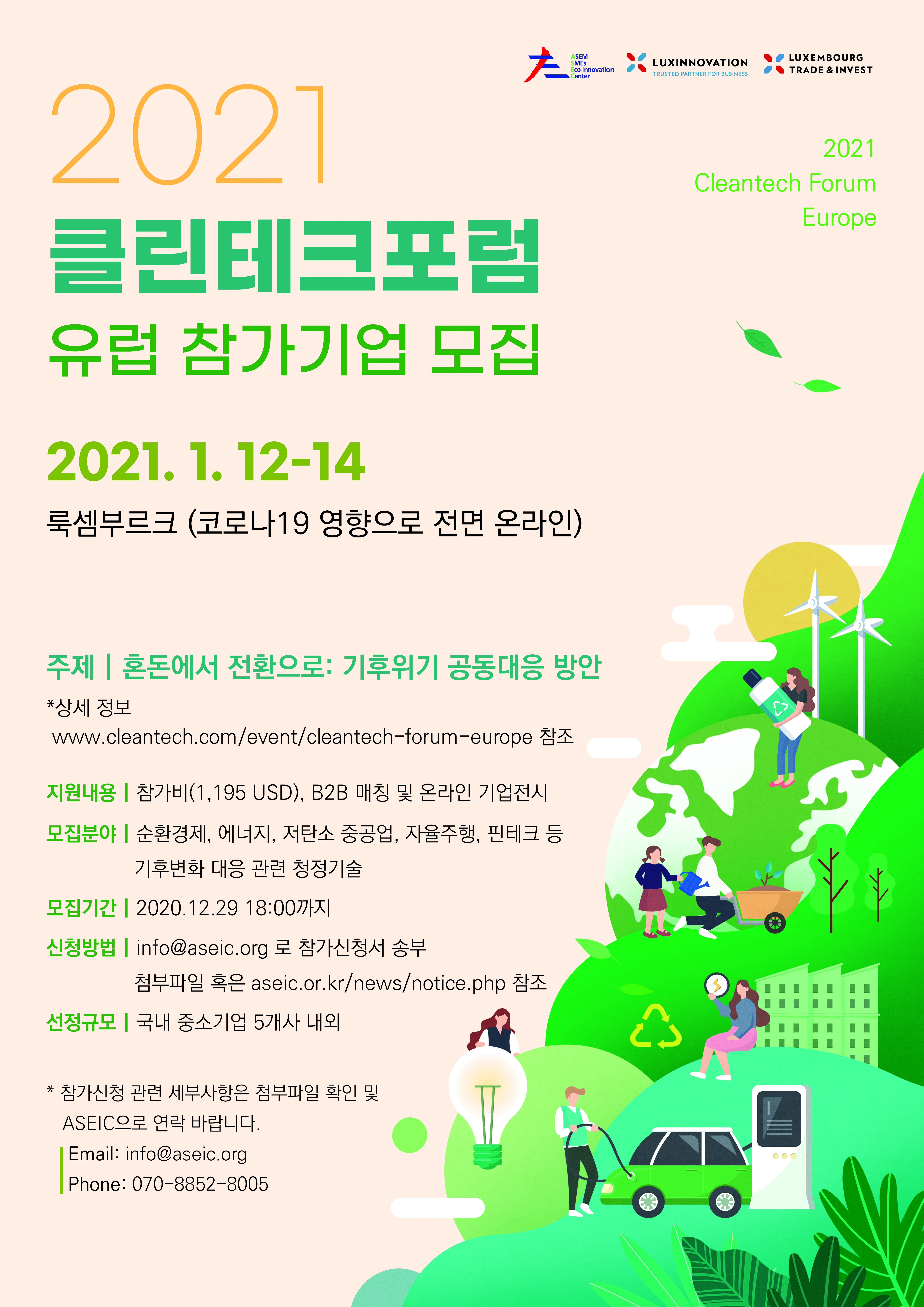 ![]() 아셈중소기업친환경혁신센터는 룩셈부르크의 혁신청(Luxinnovation)과 함께 한국 중소기업과 스타트업의 유럽 시장 진출 및 투자 유치를 지원하기 위하여 2021년 1월에 개최되는 클린테크 포럼 유럽 (Cleantech Forum Europe)*의 참가 지원 사업을 아래와 같이 공고하오니 많은 참여 부탁드립니다.