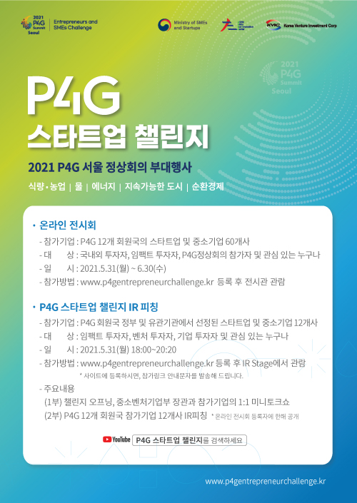 네트워킹 플랫폼인 "2021 P4G 스타트업 챌린지"는 기업과 투자자를 위한 온라인 전시회 및 IR피칭 행사를 제공합니다.